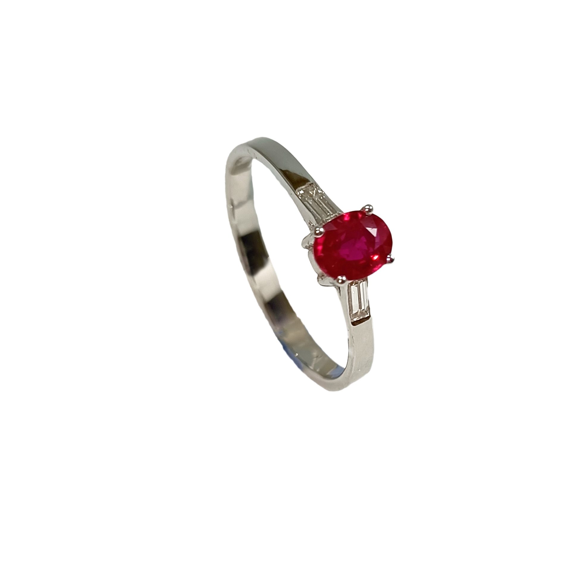 Sortija en oro blanco, con rubí y dos diamantes t.baguette